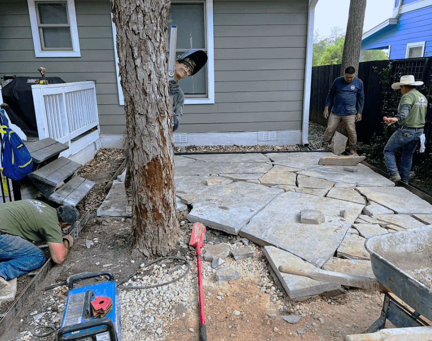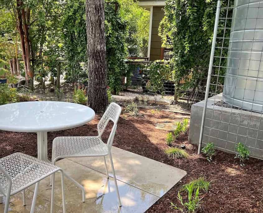 Emphasizing preservation, we repurposed existing limestone pavers into a permeable pathway surrounding the rain garden. This approach protected the mature oak trees’ critical root zones, minimized construction waste, and maintained natural water infiltration patterns.