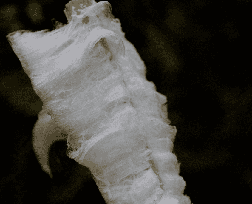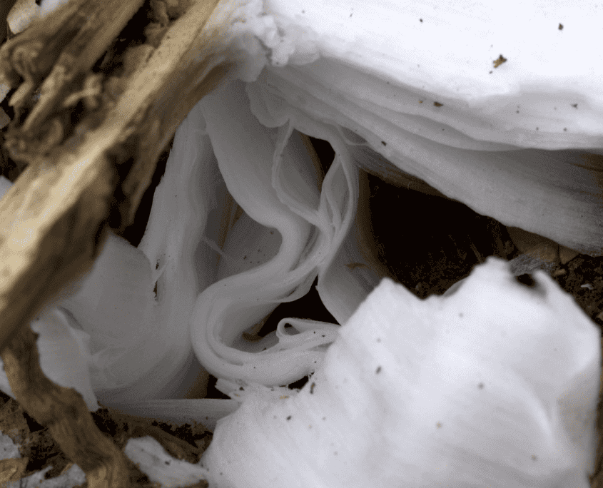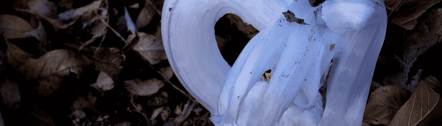 As the air drops quickly below freezing, but when the ground remains relatively warm and moist, sap from the active root system of the plant pushes up through the above-ground stem. As the sap freezes, it splits the stem and begins to produce delicate ice “flowers” that can sometimes resemble white roses made of ribbons, or maybe a large tuft of cotton. Often, the tendrils of frozen sap will continue to grow for as long as the ground stays warmer and the air stays cold. It’s not uncommon to find these ribbons growing to a foot or more over prolonged cold.