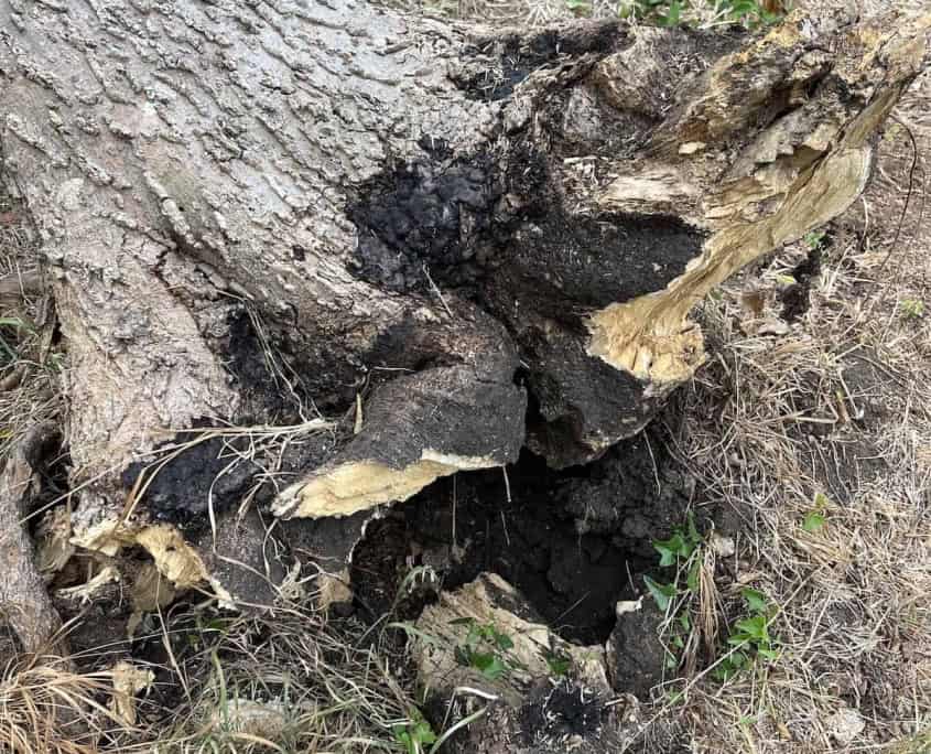 Various fungal growths can appear on a tree trunk. One Kretzschmaria deusta growth at the base of a hackberry, also in Maas’s backyard, indicated that the tree was likely not only strained, but dying on the spot. It was only a matter of time before it fell over, so our crews removed it promptly.